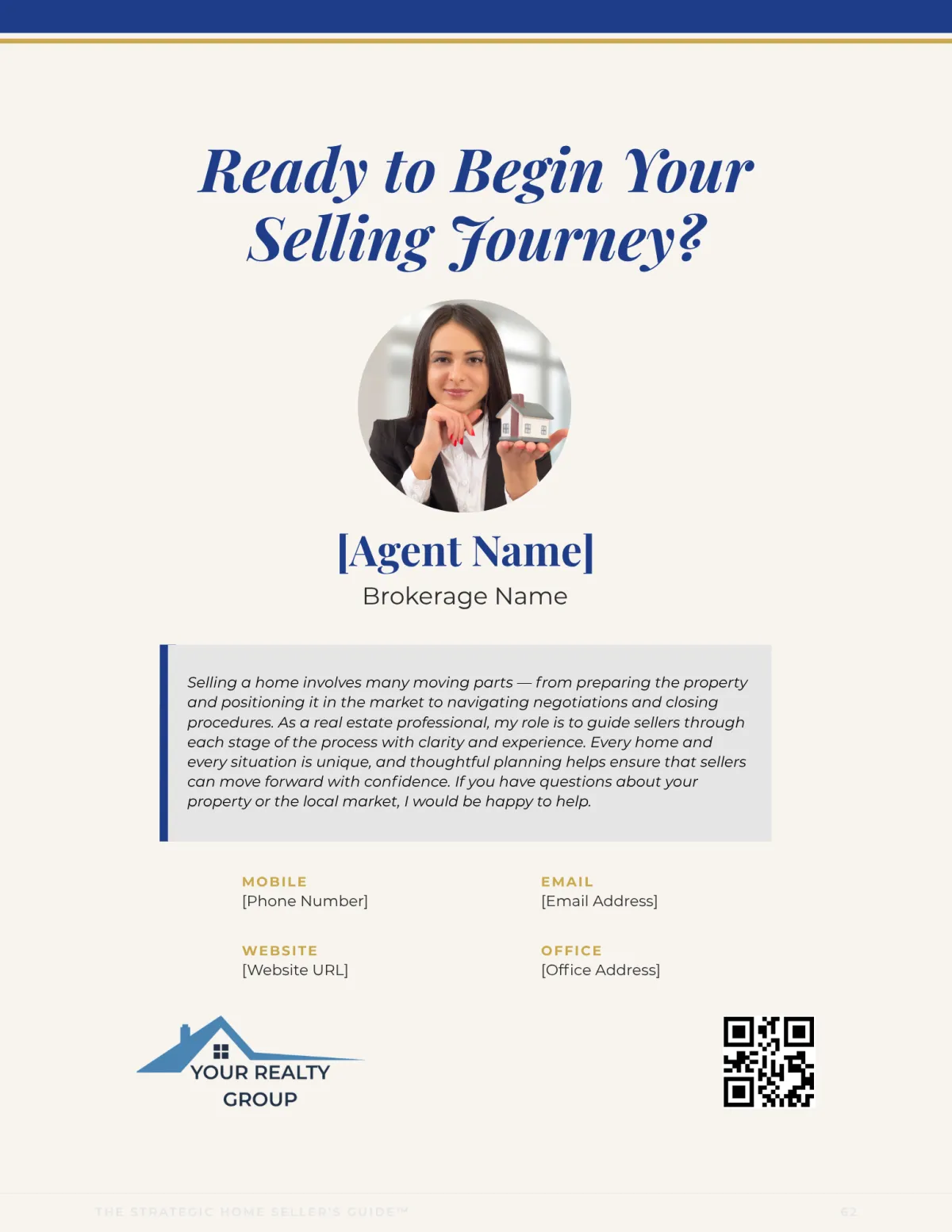 It closes with your agent's branded contact page — so the last thing every seller sees is a reminder of exactly who is guiding them.