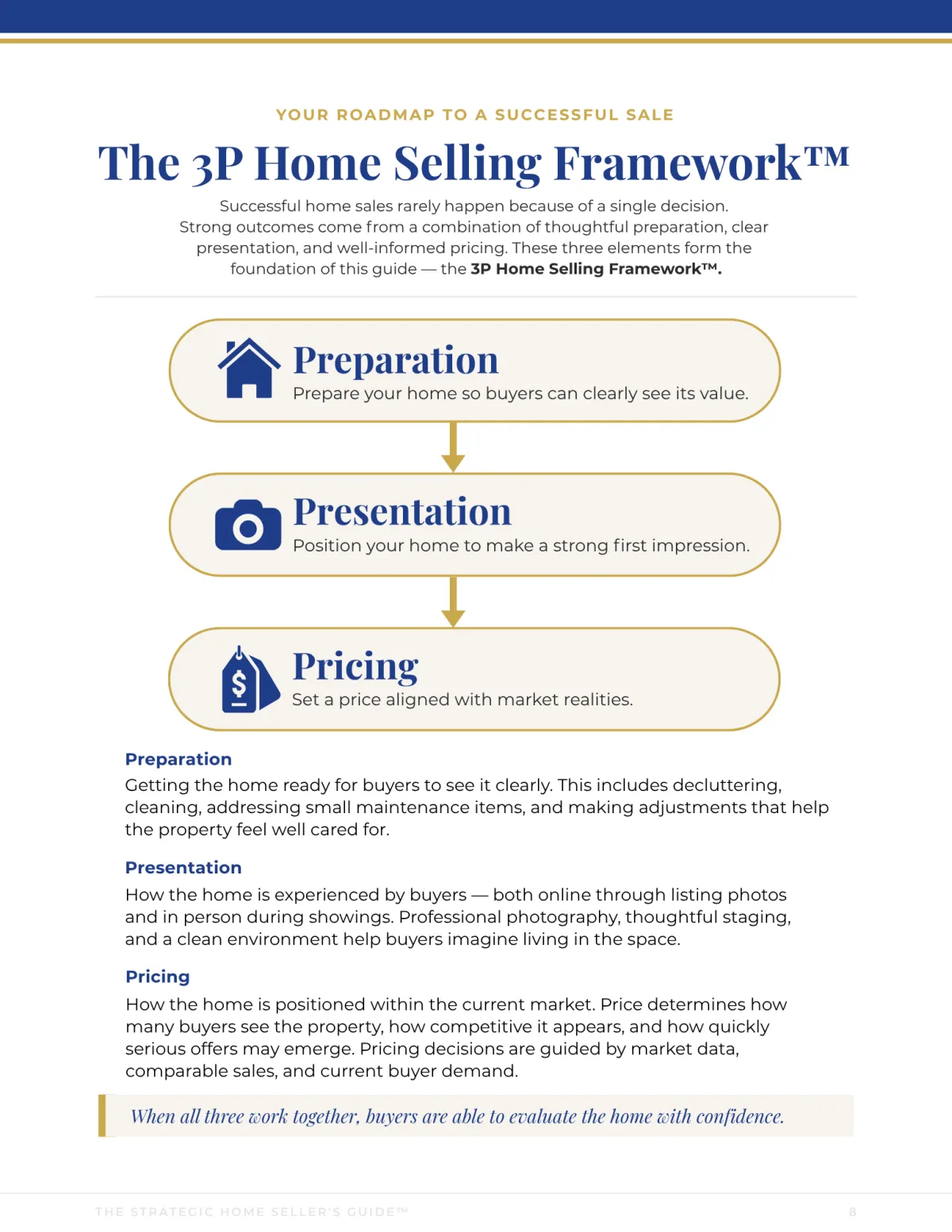 The Strategic Home Seller's Guide™ is built around the 3P Home Selling Framework™ — Preparation, Presentation, and Pricing. It gives sellers a clear, structured understanding of the entire selling journey. Your brokerage brands it. Your agents give it. Your sellers arrive ready.