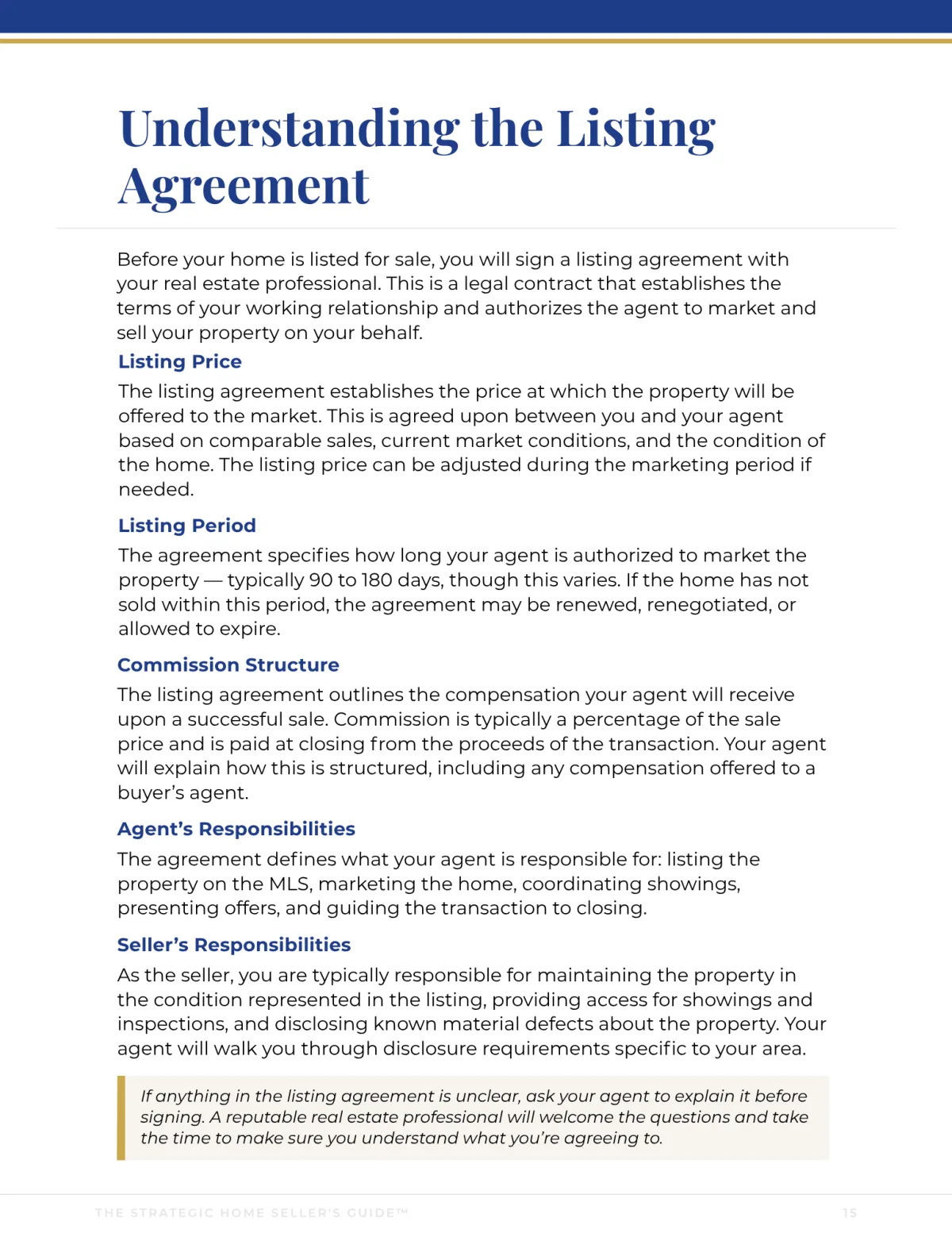 The Strategic Home Seller's Guide™ is a professionally structured seller education system that brokerages license, brand as their own, and give to every listing client —
